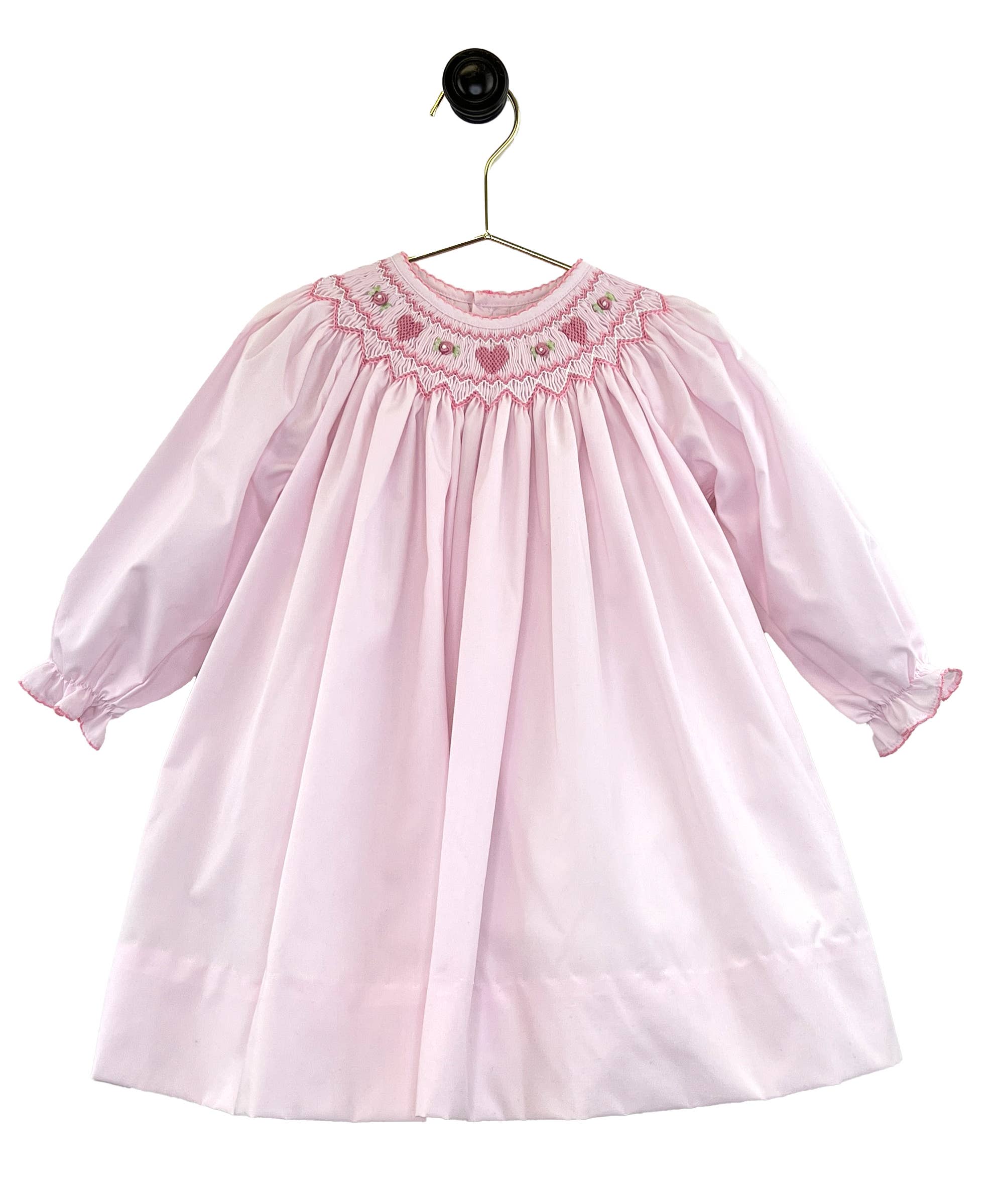 A classic long sleeve dress with sweet and simple bishop smocking with heart details. What a perfect outfit! Great for Valentines day but simple enough for any occasion, this heart smocked dress is perfect for winter or spring. The lightweight and airy pink T/C fabric keeps little ones cool and comfortable and is easy to care for - just machine wash and tumble dry! Matching bloomers included on sizes 3 Months through 24 Months.