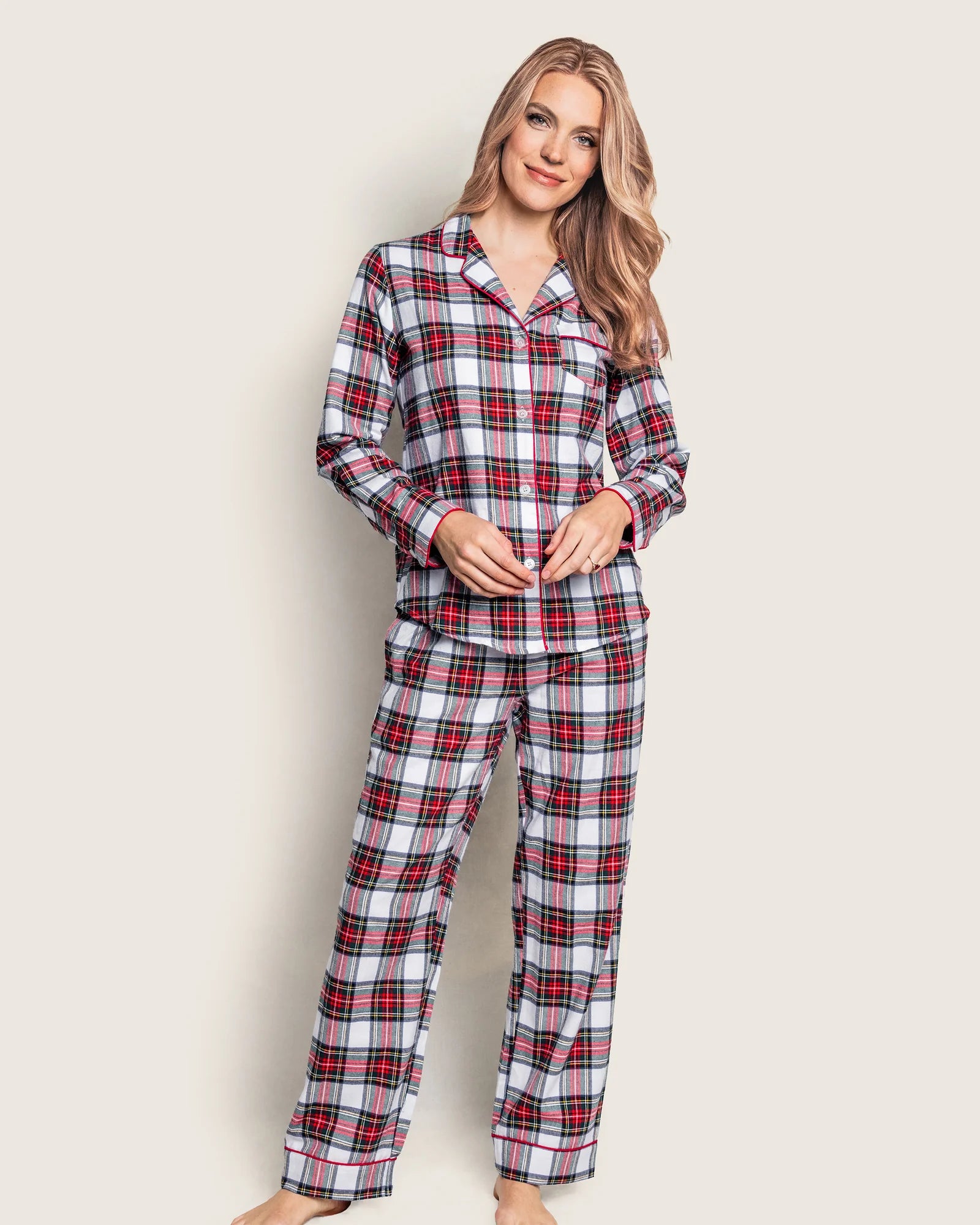 The Petite Plume Tartan pattern showcases a harmonious blend of rich colors and intricate lines in an iconic tartan print on white ground. With its roots in Scottish tradition, this classic pattern exudes a timeless charm that adds a touch of refinement and sophistication to your holiday wardrobe.  This classic brushed twill pajama set is accented with red piping and finished with pearl buttons.